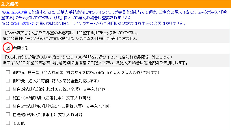 ※オンラインショップにて新規会員登録頂き、ご注文画面時(送付先の入力)の注文備考欄にあるチェックボックスにチェックを入れてください。