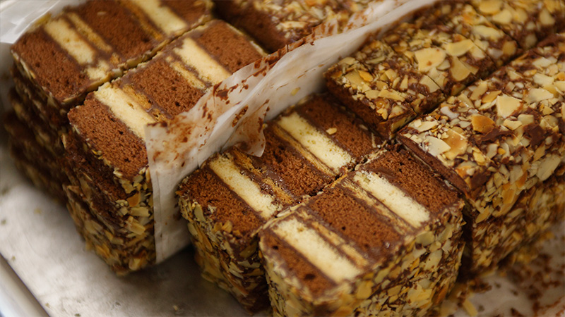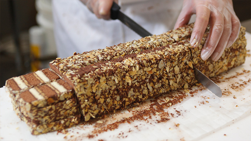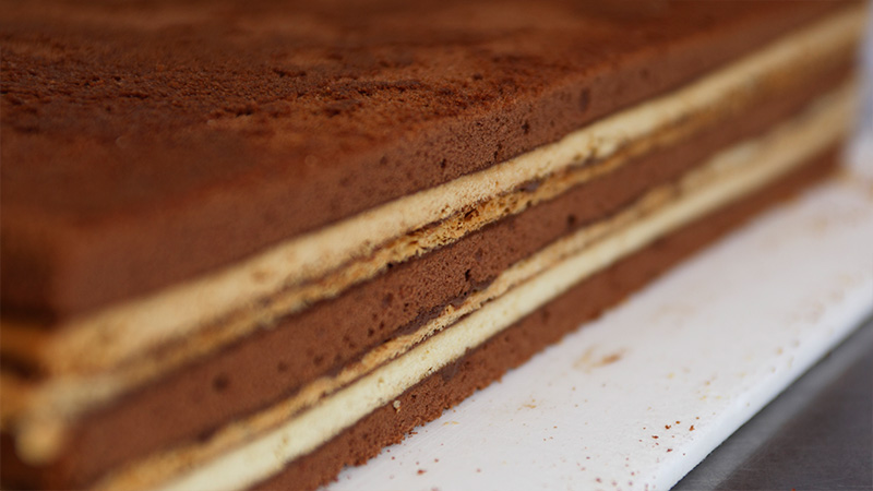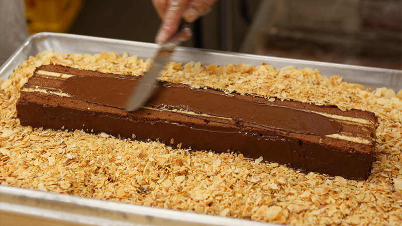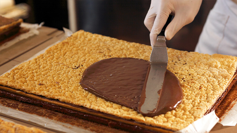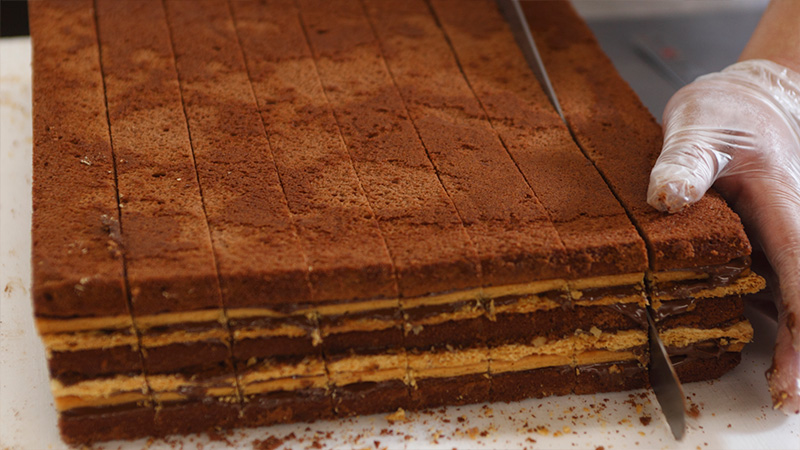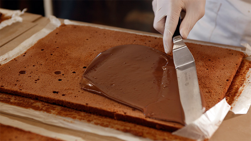 スポンジ菓子の味によって、純チョコレートやモカチョコレートを用いて重ねていきます。